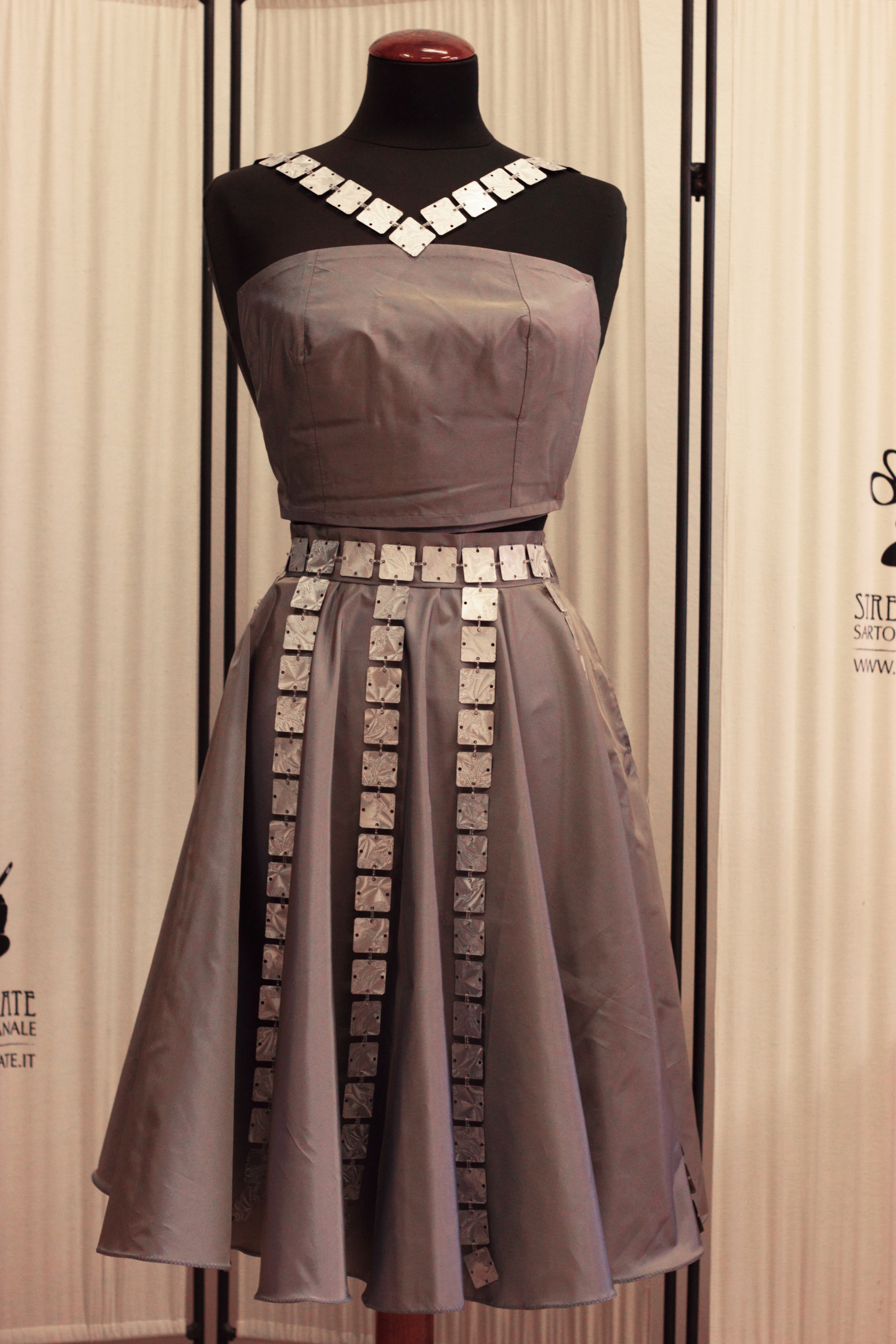 L’abito è il terzo nato della collezione che vede l’utilizzo dei quadrati di alluminio Bandelli Line.