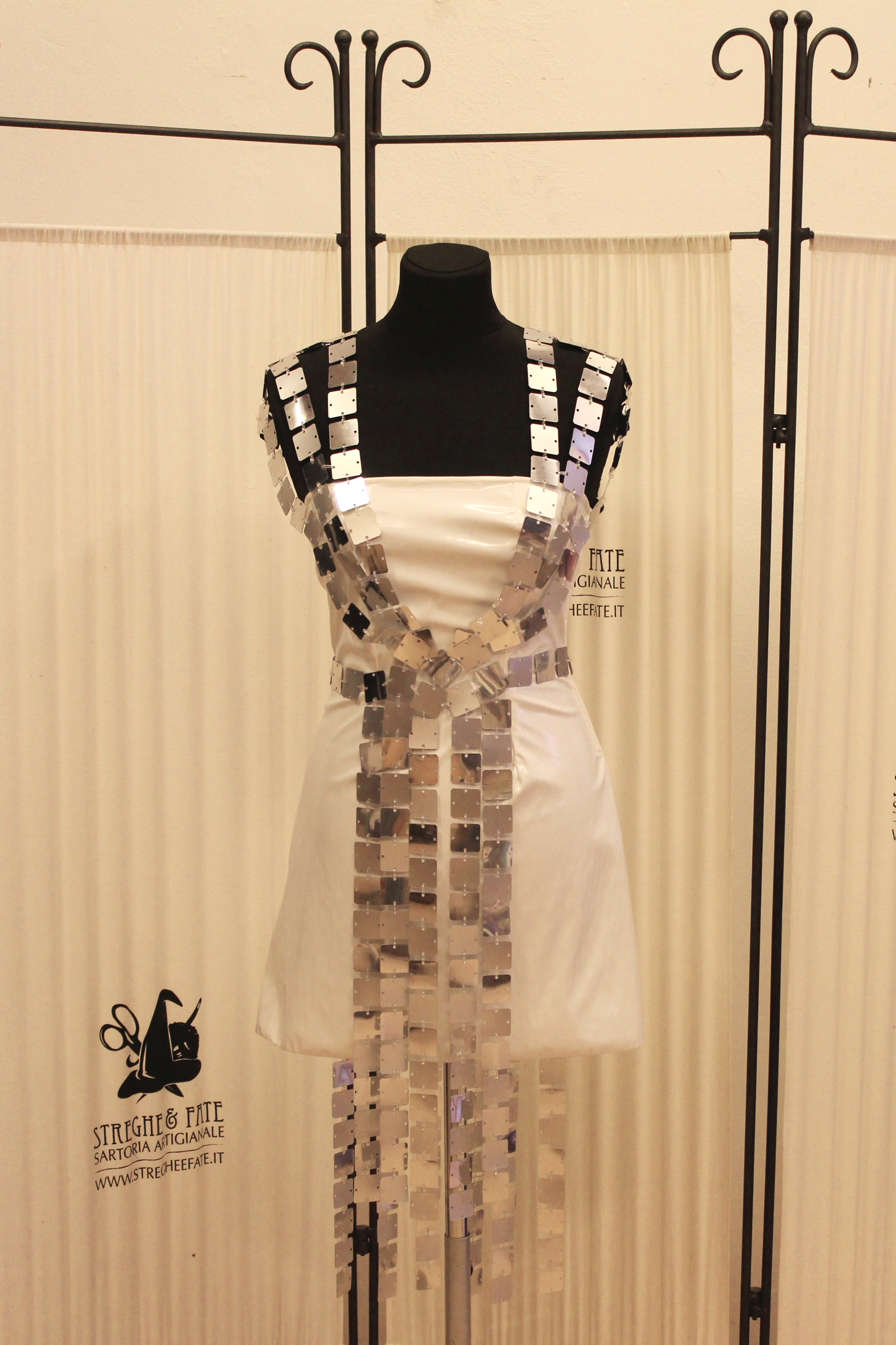 “Ispirazioni musicali rock ’80 per l’abito “Fashion Glam”. Il vestito bianco iridescente è illuminato da una composizione di quadrati argentati che coprono e scoprono le spalle e giocano con le lunghezze e il movimento. “